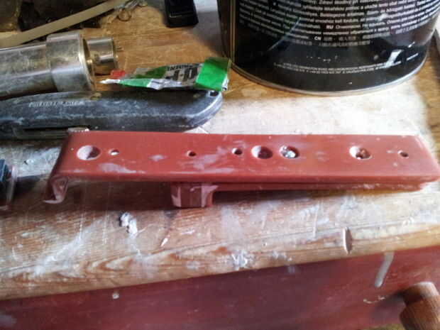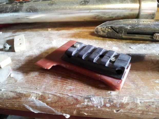 Debido a un enorme golpe de suerte, mi abuelo era tirar parte de una vieja pistola, que tiene un riel picatinny de exactamente 2 cm. construido en él. Esto significaba que podía cambiar la construcción de la montura de carril mucho más firmemente mantener la copia de seguridad de vista. También significaba que podía usar el carril para mejor soporte del carril mal pegado, así que había atornillado en dos lugares por lo que era muy sólido. Yo también atornillados el riel principal porque repetidamente cayó aparte y la vista se basó en esta sección mantiene juntos.