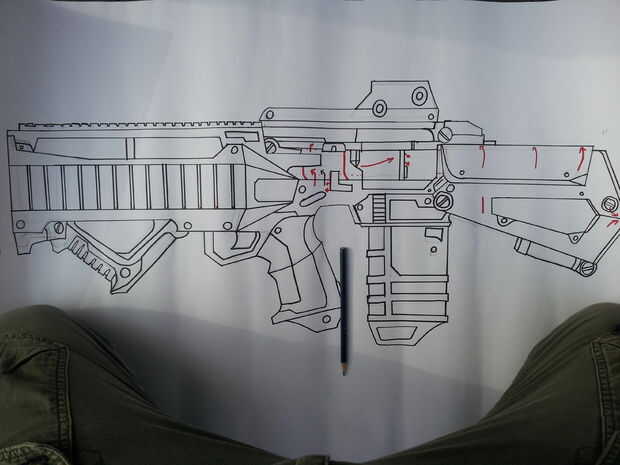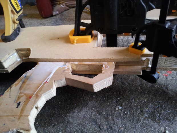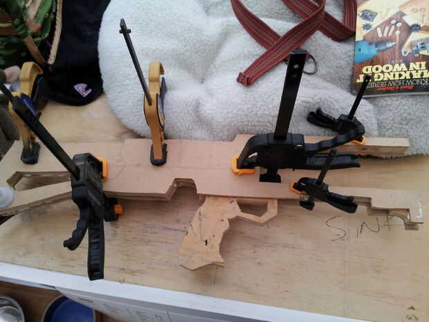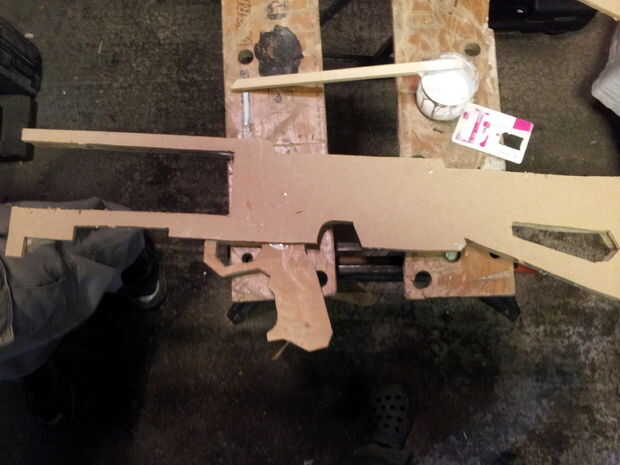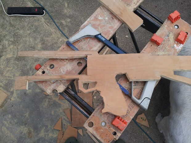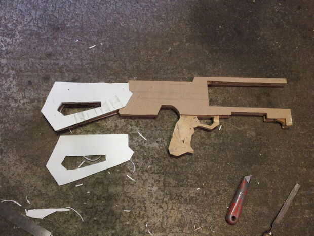Entonces usted necesitará espesar para arriba en ciertas áreas según sus planos - que está en todas partes no como el mango y gatillo, entonces la acción debe ser incluso más grueso. Otra vez, MDF es fácil de trabajar con el cartel plástico forro material que tenía (si alguien podría identificar esta en los comentarios que serían realmente útiles). Aviso en el quinto cuadro justo al pasar el gatillo que dejé un zócalo para el mango delantero para ranura en más sobre esto más adelante.