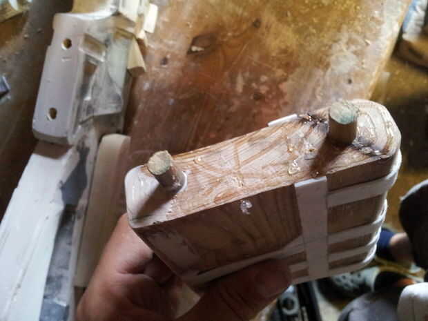 Usted querrá esperar perfectamente feliz con las piezas circundantes antes de colocar la revista en el resto de la pistola, pero cuando lo haces de buena práctica para perforar los agujeros y usar clavija de madera para la fuerza y estabilidad adicional. Asegúrese de que le taladre el agujero lo suficientemente grande, que terminó se agrieta mi madera pues he probado el pasador del martillo en un agujero que era demasiado pequeño.