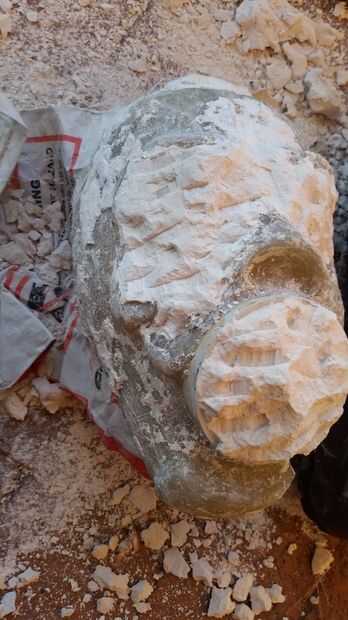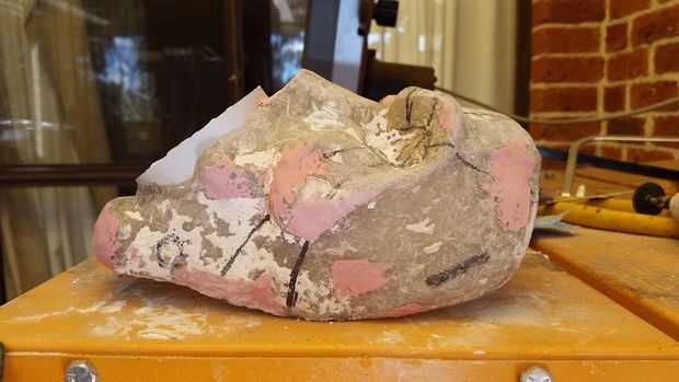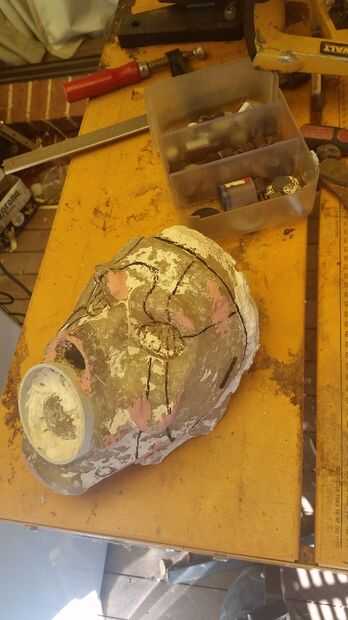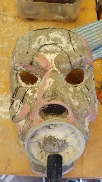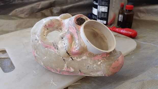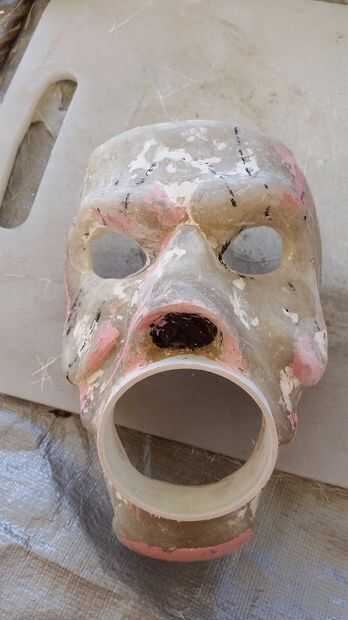Centrarse en la eliminación del yeso alrededor de la máscara, dejando zonas delicadas como la nariz y la boca o cualquier área pura de la resina se hace con más cuidado. Esperemos que el PVC ha pegado en la fibra de vidrio y no ha sido quitado en la extracción de yeso.