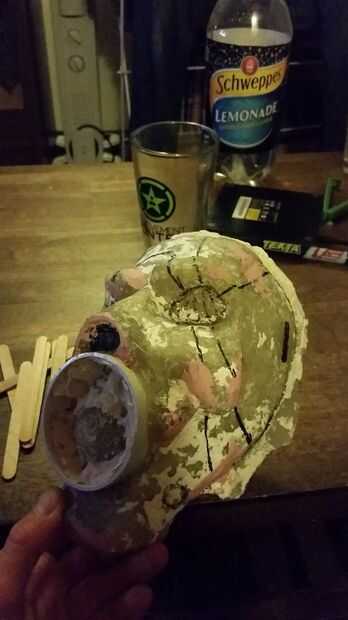 Una dremel o dispositivo similar, corte alrededor del borde de la mascarilla para darle la forma deseada, quitar los ojos de (pedazo de router funcionado muy bien) y retirar el yeso y fibra de vidrio desde dentro de la tubería de PVC. Las principales herramientas que utiliza en este proceso fueron el pedazo de router, pieza de corte y lijado de piezas. Los pedazos del router eran muy buenos para quitar los ojos y mezclar en las cejas, eliminar el resto del yeso del PVC con el vidrio de fibra. Luego cambiar a lijar para alisar del borde de la máscara y dentro de la boca que quede al ras.