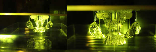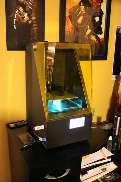 Así que tengo mi archivo 3D listo para imprimir y que con el envío a mi impresora de resina. La mayor diferencia con este tipo de impresora es que el modelo obtiene continuamente cayó en la resina líquida. La impresión se hace con un láser una capa recogiendo el modelo caer hacia abajo y repitiendo hasta que se completa el modelo de solidificación. Una impresora de resina es increíblemente exacta pero impresiones toman mucho tiempo para construir.