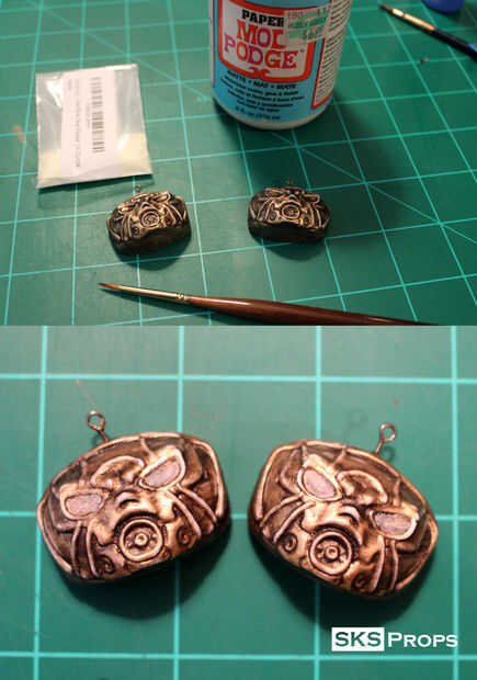 Una vez que fueron pintados sólo sentía que necesitaban algo extra. Así para darle vida a los que añadido algunos brillan en el oscuro polvo recogido hasta sucesivamente Amazon. Este polvo es muy fino pero se ilumina mejor que cualquier pintura que he usado alguna vez. Para obtener el polvo que se pegan a los ojos usé un cepillo muy pequeño y había pintado Mod Podge en los ojos. Entonces mientras el Mod Podge húmedo espolvoreado el polvo sobre la cara y hacia abajo en los ojos para asegurarse de que asiente correctamente. Una vez sentí había secado lo suficiente yo con la punta de las cabezas sobre la bolsa y cepillado lejos cualquier exceso de polvo. El resto del pendiente fue montado usando un anillo de salto y un par de granos del metal para la decoración.