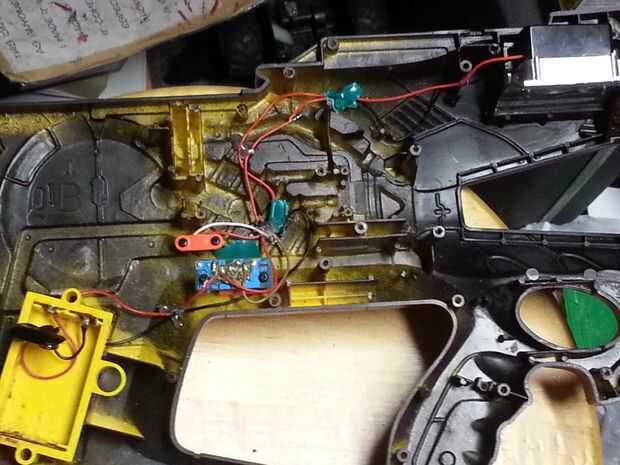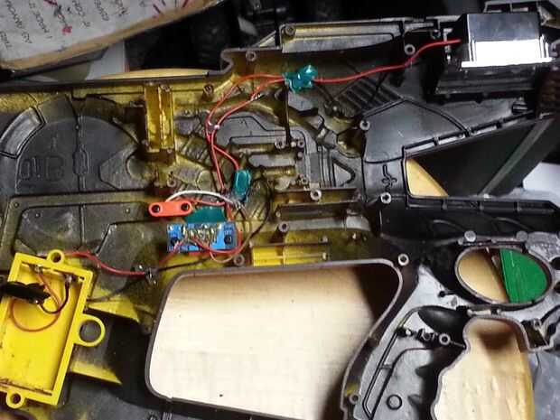 En este paso, su también una buena idea hacerle modificaciones si va a hacer nada. En la mía que decidí sacar la cámara flash función de firefly y reemplazarlo con una brillante linterna de 9 led que compré en mi tienda local de dólar. No pretender ser un experto en electrónica para que libremente se acuerdo contigo que mi cableado es un lío. Sin embargo funciona y es soldado, por lo que no pronto suelto o desconectado en cualquier momento. Cuando haya terminado de cablear su Firefly, caliente pegue los cables hacia abajo para evitar que captura los componentes mecánicos. Si usted planea duplicar mi cableado, asegúrese de añadir una resistencia antes de la indicación de alimentación led. Mina terminó quemando durante la prueba final de ajuste y no siento la necesidad de reemplazar debido a que la torreta toda es esclarecedora que debe significar que está en... De todos modos también puedes ver mis proyectos está pintado, pero estas son las fotos solamente de mi cableado y prueba. Cubriré la capa base en el siguiente paso.