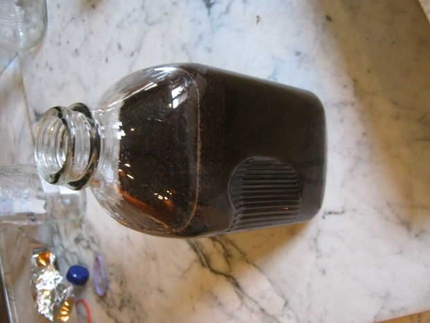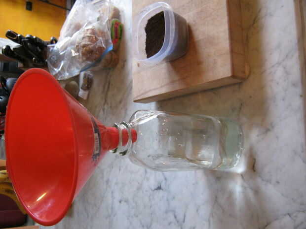 Vierta una botella de vodka en la botella de vidrio grande (este es medio un galón). Ahora coge un embudo y vierta el café lentamente. Cuando se agrega el café, verter la otra botella de vodka en la parte superior.