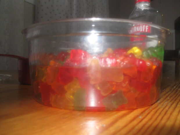 -El primer paso es abrir la tapa de sus osos de gummi y vierta el vodka. La cantidad y la marca es a su discreción, aunque he encontrado 1.5 tazas de Smirnoff vodka para ser el mejor. He probado esto con vodka de frambuesa, con resultados placenteros. Básicamente, vierta el vodka en los osos llenos hasta que el alcohol apenas asoma sobre la parte superior.