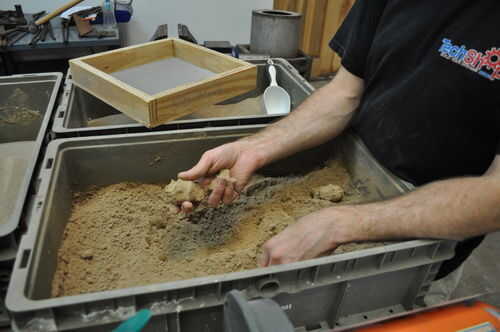 Es el primer paso en cualquier proyecto de fundición para preparar la arena de fundición. Empezar por tamizar la arena para eliminar los residuos y romper grumos. Luego añadir agua para templar la arena que pega junto. Añada suficiente agua para hacer la arena ligeramente húmeda pero no mojada. Deben agrupan al apretarlo en tus manos y descanso limpio en lugar de desmenuzarse cuando se rompe. Si añades demasiada agua la arena consigue pegajosa y se pegan a las herramientas y su patrón, lo que hace difícil trabajar con. El agua también genera vapor, que puede interferir con la calidad de la fundición.