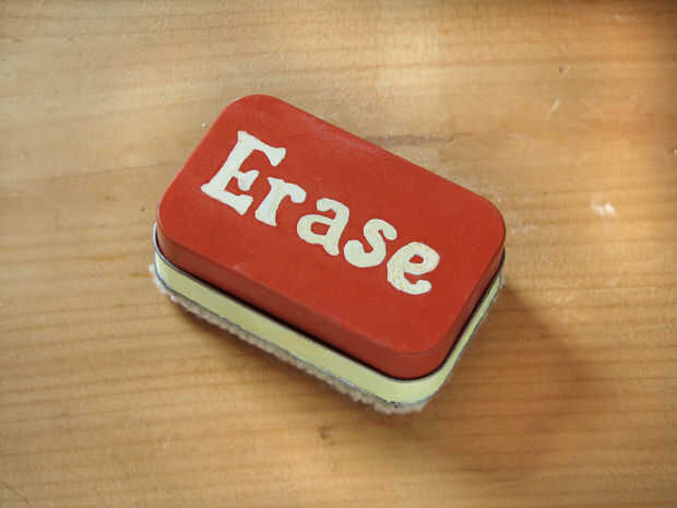 Oh, y ¿he mencionado que está hecho de materiales de reciclado casi en su totalidad? Dos Altoid (o similar) latas y restos de un viejo suéter conforman la estructura de la base y la almohadilla de goma de borrar. Un poco de pegamento para sostener cosas Junta, pintura bonita mirada y voilà!  Usé pintura en aerosol naranja que tenía sobras de un proyecto anterior y de un simple título rotulado a mano para mi diseño, pero (naturalmente) puedes hacer tuyo con todo lo que diseño te gusta.