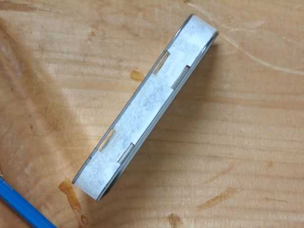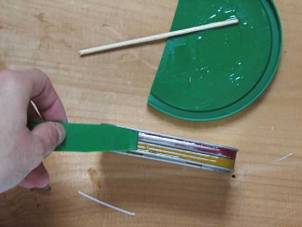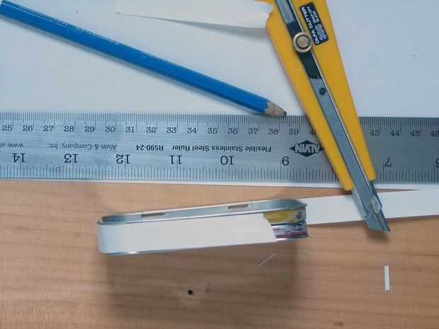 Cortar una tira de papel para que exactamente se cubre el espacio entre el borde rodado de dos tapas. Cortar pequeñas muescas para alinearlos con los orificios de la bisagra.