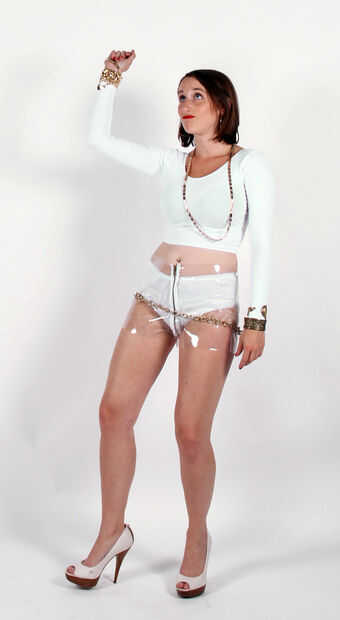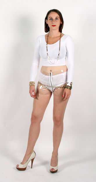 - Elemento plástico: pantalones con cremallera frontal blanco con dientes metálicos.
