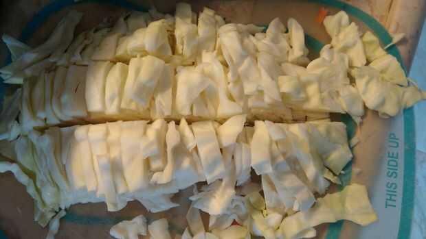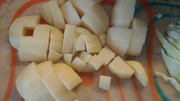 Añadir al caldo hirviendo cortar patatas y repollo. Dejar hervir hasta que esté casi cocido.
