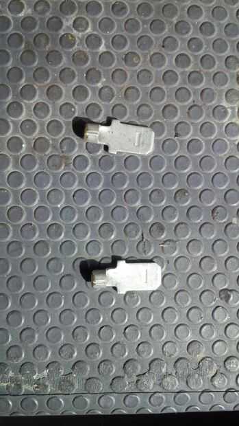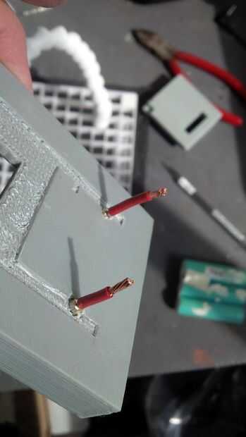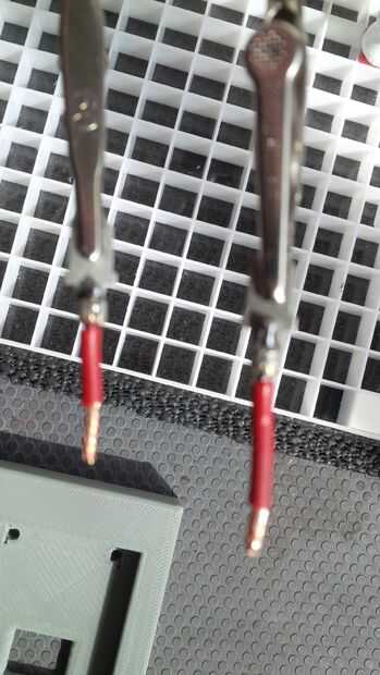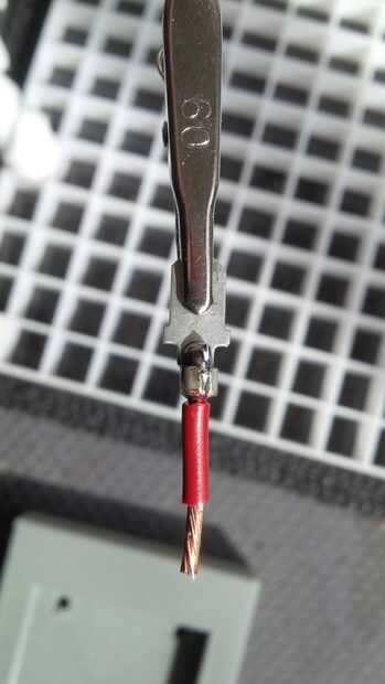 Conectores de horquilla estándar (14ga) y la soldadura de cables a los conectores. Pase los cables por el hols y alicates de punta para instalar los conectores de horquilla como se muestra. La parte impresa les debe agujeros lo suficientemente bien para interactuar fácilmente con la batería Bosch.