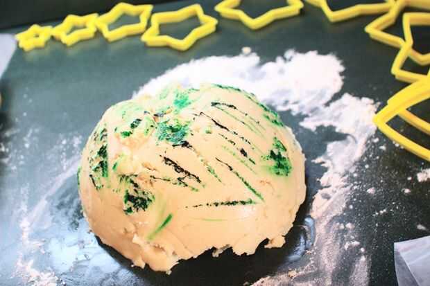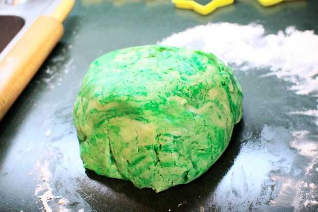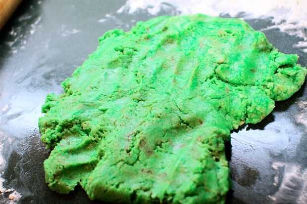 • Añadir un poco de colorante de alimentos verde pegar estilo y amasar la masa para crear un efecto mármol. Añadir un toque de marrón y amasar la masa un poco más para distribuir el color marrón.