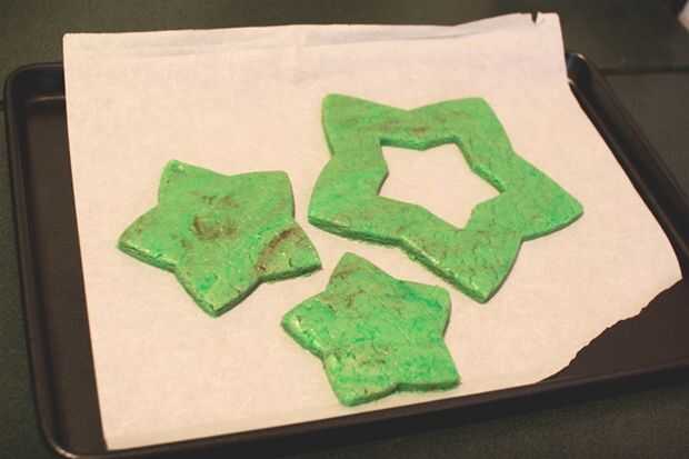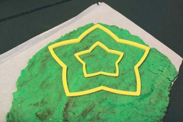 • Despliegue su masa para galletas y cortar sus formas estrellas con atención para asegurarse de que corta bastante de cada tamaño para lograr los tamaños del árbol deseados. Me lanzó la masa sobre papel sulfurizado y quitado la chatarra alrededor de los cortes como mi masa estaba muy suave después agregué el color de los alimentos.