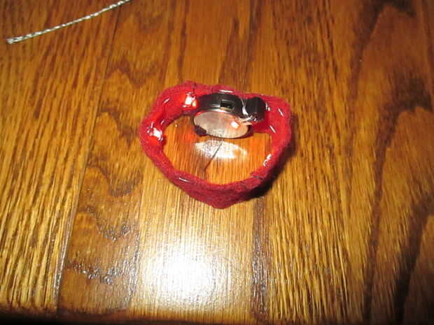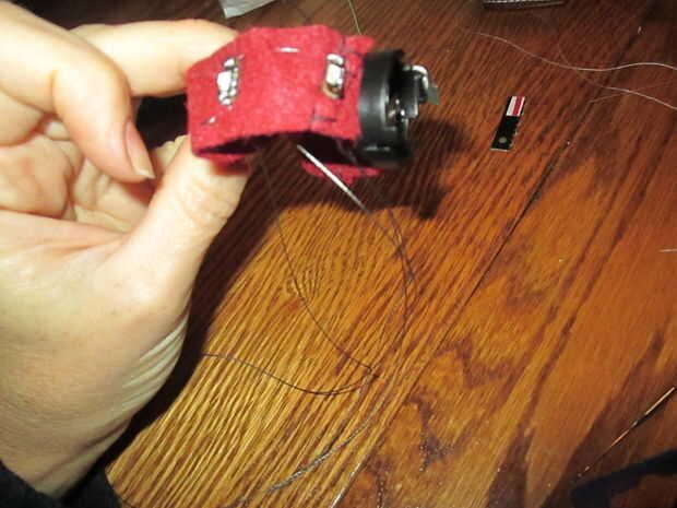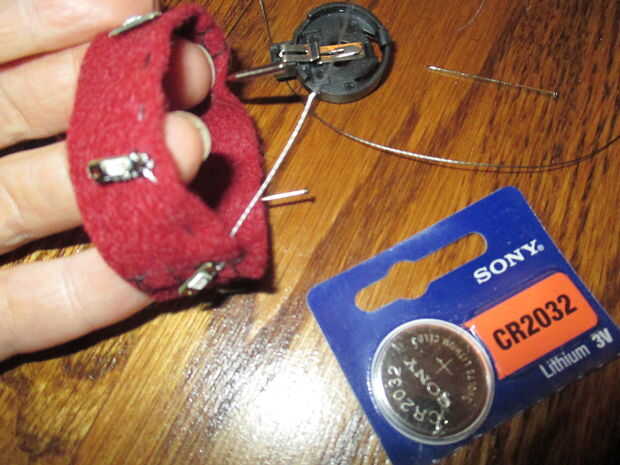 6/7/8/9. I coser lentejuelas de LED rojo 5 en fieltro con hilo conductor, había alimentado con una pila de monedas y colocarla dentro. Aseado-o!!!!
