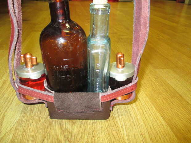 Tengo 2 frascos pequeños y muy dos botellas viejas que quiero crear una unidad unificada. Algo de cuero que puedo adjuntar una correa larga a y llevar sobre mi hombro, en mi pecho, estilo messenger.