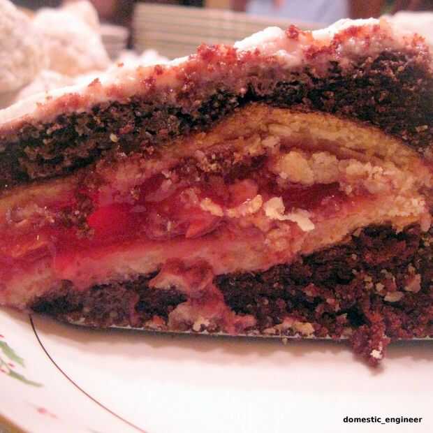 Este es el Turducken de postres. Me inspiré en un amigo que hizo un Cherpumplle, un pastel de cerezas, pastel de calabaza, y pastel de manzana cada uno cocido en un pastel, apilados juntos y helado como un postre extrema. Una idea de genio, pero yo quería empezar con algo un poco más sencillo. Aquí está mi Pake bosque negro o Cherry Chocolate pastel pastel.
