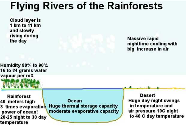 El aire seco pesa un promedio de alrededor de 29 gramos por topo. Vapor de agua pesa cerca de 18 gramos por topo. Así que si se agrega vapor de agua al aire seco el aire consigue más ligero! (Rimar de instructables me dijo que hace años y yo nunca pensé de él antes de eso)., luz aire húmedo se eleva porque es... más ligero que aire seco... Esto significa que el aire sobre el mar es generalmente una presión más baja que el aire sobre la tierra, (porque hay mucha agua que se evapora en el mar!) Sin embargo, árboles transpiran mucho vapor de agua (si está disponible en el árbol) y en teoría podría transpirar más de lo que puede evaporarse de los océanos. Esto es porque tienen mayor superficie y fotosíntesis requiere transpiración de todos modos. Así que el aire alrededor de los árboles es más ligero y se eleva. Esto aspira más aire para fuera de la zona. El aire ascendente es más frío que se levanta hasta que se alcanza el punto de rocío. El vapor de agua se condensa, se convierte en nubes y n va hacia abajo. PV = nRT es la ecuación de gas universal. Cuando n alta en el cielo, es reducir la presión allí. Así que tenemos una bomba que tiene una longitud de carrera es un par de millas de altura, las nubes son los "anillos" y los árboles actúan como hervidor de agua en fuego lento hervir más agua"luego llueve y se elimina la mayor parte del vapor de agua desde el aire. La teoría de la bomba biótica afirma que extremadamente intensivo muy eficaz transpiración de los árboles y eficiente condensación y precipitación crea una zona continua de día y de noche baja presión sobre el bosque y esta "gana" aspira más aire húmedo sobre el mar. Bucle de realimentación positiva, absorbe más humedad y crea un viento predominante. Hacia la tierra! Como la zona arbolada es bastante grande y creciendo activamente, la tierra va a ganar la batalla de bajas presiones, aspirar el aire y crea el viento reinante!