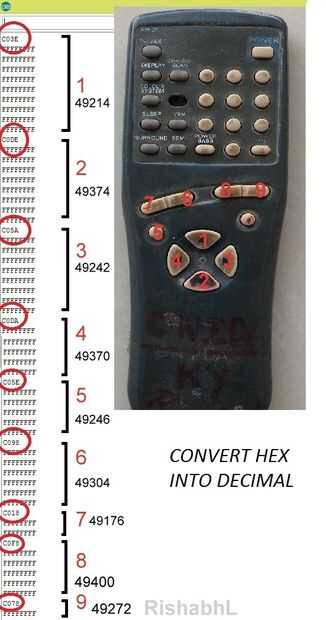 Cargar código hexadecimal a arduino y obtener valores hexadecimales en el control remoto. Todos los valores son diferentes para diferentes controles remotos.