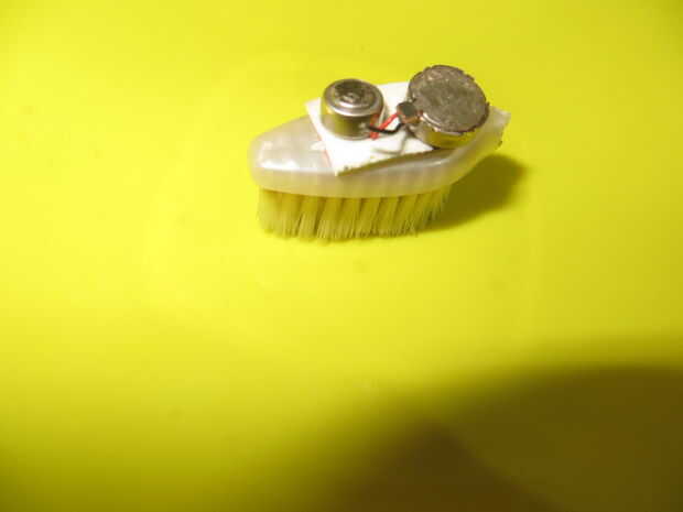 Material:1 Brushtop2 Motor de la vibración3 cinta aislante deCélula de batería de litio 4.CR2032Paso 1: Material1 Brushtop2 Motor de la vibración3 cinta aislante deCélula de batería de litio 4.CR2032Paso 2: ConfigurarLa primera cinta el motor en la p