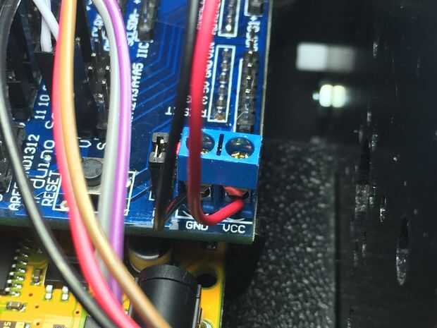 -Conecte el cable negativo (GND) de la batería motor un pin GND en el escudo del motor.