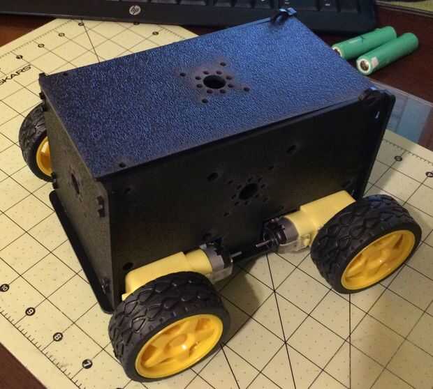 Primero montar el chasis siguiendo las instrucciones incluidas con el chasis o el video. Después de terminar debe tener algo como la imagen. Al colocar la placa que contiene el controlador en el bot, asegúrese de que colocarlo en los agujeros mediados. Esto dejará espacio en el frente y la parte posterior del bot.