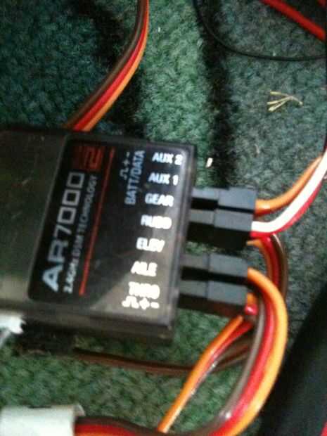 Ahora Asegúrese de que tiene todos sus cables se conectan en estos puertos: adelante en ELE, convertir en Aile, controlador de bandeja de disco en marcha, squirter agua en THRO y el servo girando la pistola de agua en AUX1