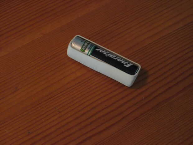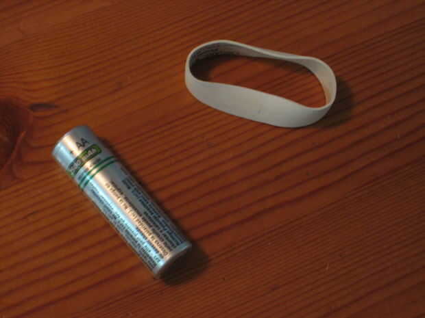 si usted tiene un soporte de la batería AA uso que de lo contrario tomar una goma gorda que cabe firmemente alrededor de la batería poner alrededor de la batería pegar la goma a la parte inferior de la estructura de la pierna. Vuelva a colocar la batería en la goma