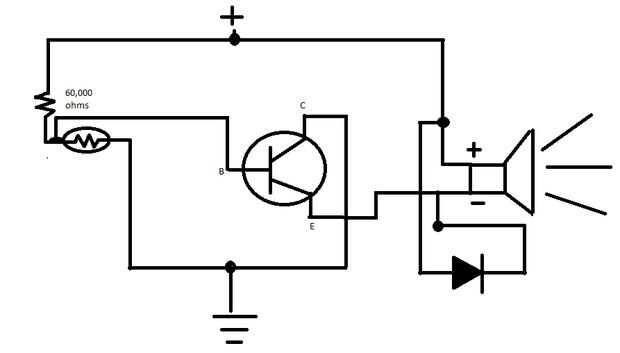 en cuarto lugar, está conectado el emisor del SCR (la pierna izquierda con el circuito otra vez mirando hacia usted) hasta el final de la negatinve de lo LED y el zumbador...