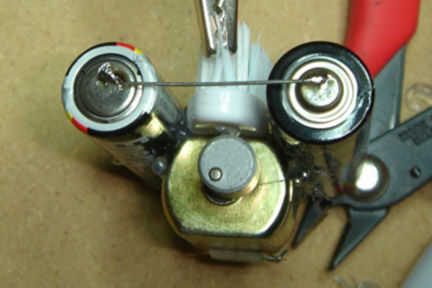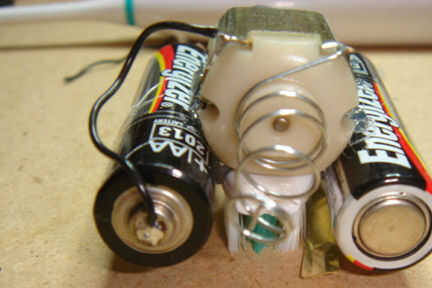 Cambio de la batería fresca 1 que vino con el cepillo de dientes a pilas casi muertas 2, unos 1.3V cada. Dos baterías da un poco más de jugo, por supuesto, pero también hace un montaje simétrico, equilibrado.