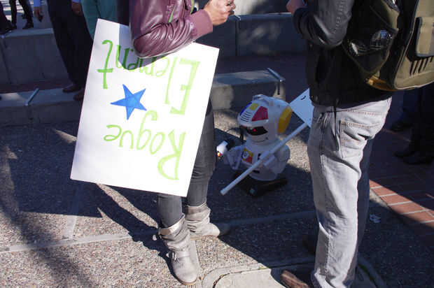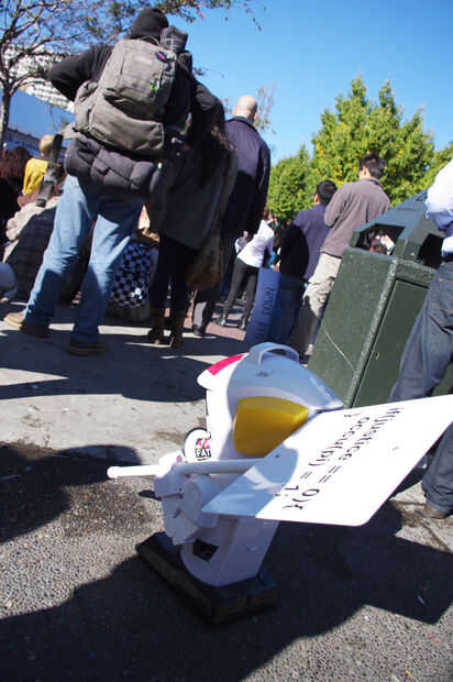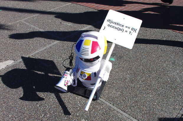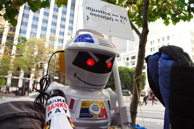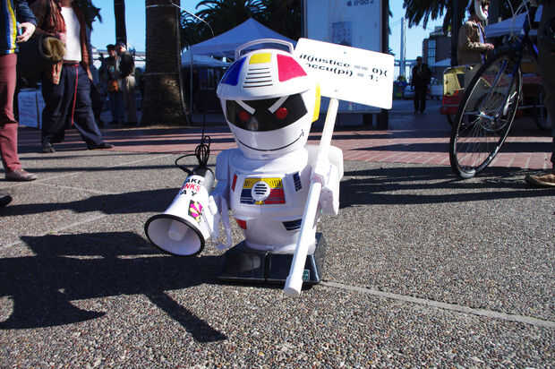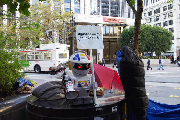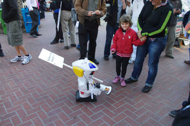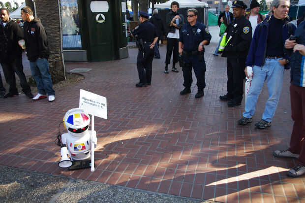 aprender de las lecciones del 1%, enunciados tercerizar nuestro trabajo relacionado con ocupar a una mano de obra robotizada. Obviamente, robots tienen muchas ventajas sobre sus homólogos humanos. Por ejemplo, robots nunca se cansan, no enfría, no dormir, ni comer, no necesitan tiendas de campaña, y cuando la insurrección armada se convierte en necesario, los robots son mucho más moralmente ambivalentes. Además, tuvimos una discusión con un miembro no identificado de la policía de San Francisco y confió en nosotros que la policía actualmente no tiene ningún plan para ocuparse de los ocupantes de la robóticas.