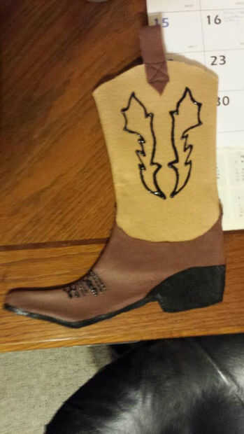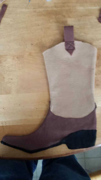 Último cosí en el levante de las correas. Realmente puede utilizarse para colgar la media así como dar a la bota un aspecto realista. Añadir y lo desea el arranque en este punto para darle tu estilo. Me corte un diseño para la parte superior de la bota y trazado con rotulador permanente luego pasó con pintura de tela negra.