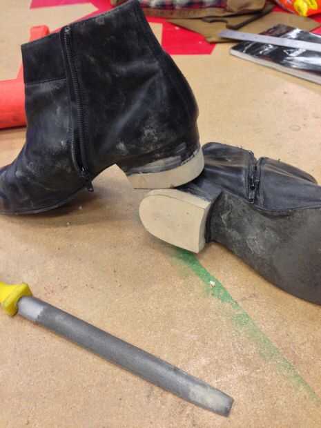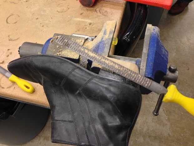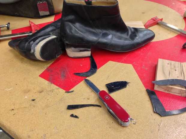 Uso de la escofina y papel de lija para hacer los talones a nivel y de altura igual. El talón de un zapato no es cuadrado como una chimenea, debe ser más alto en la parte posterior para inclinar el pie hacia delante y distribuir el peso a la bola del pie.