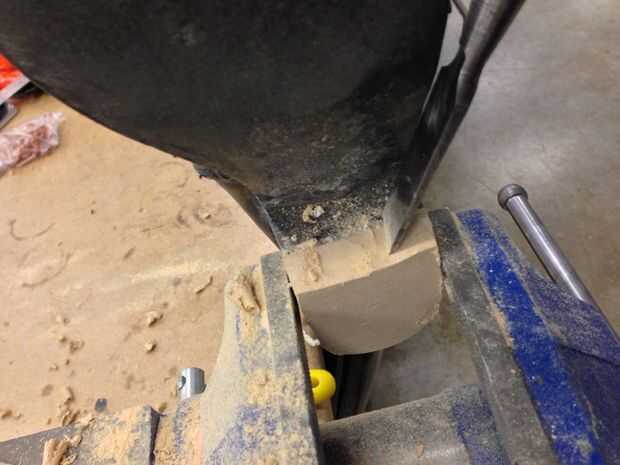 Una vez seco, el bloque tendrá que ser tallado para adaptarse a la forma del talón. Aquí estoy utilizando un cincel para la mayor parte del exceso y luego una escofina para limpiar los contornos y finalmente del papel de lija para que sea suave (una lijadora eléctrica funciona bien para esto así) del cerdo.