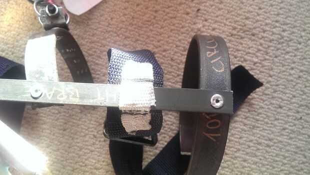 usando las correas (rescatado mina de mochilas viejas) sujeta a mi pierna justo debajo de donde el anillo superior se sienta, luego aflojó justo hasta el punto donde se reunieron la ortesis y marcó. con algunas tiras de tela, cosí luego esto a ambos lados del metal, manteniéndolo en su lugar en la rodillera. repetir esto en el otro lado debe entonces le permiten colocar la pierna en y correa firmemente, reduciendo la oscilación entre la pierna y la apoyo. Repetir este proceso por encima del tobillo para una mayor seguridad.
