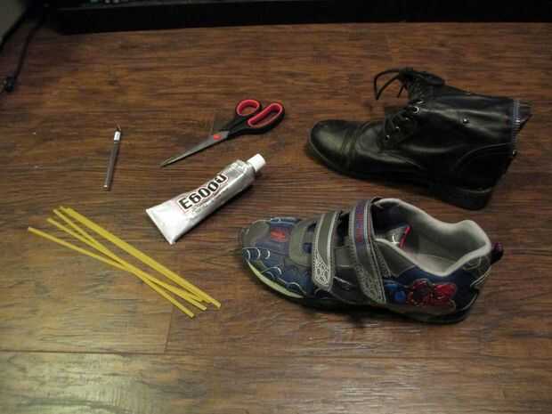 Ayuda si las botas ya están buenos de desmoronarse, tal vez los talones son tirarse fuera. Hace mucho más fácil. Las zapatillas ya tenían en mano, pero un par de zapatillas de niños del light-up se puede encontrar en tiendas de segunda mano para bastante barato. Las zapatillas no tienen que adaptarse a ti, solo tienen que tener luces de trabajo.