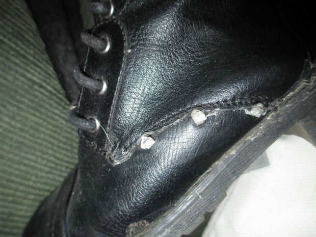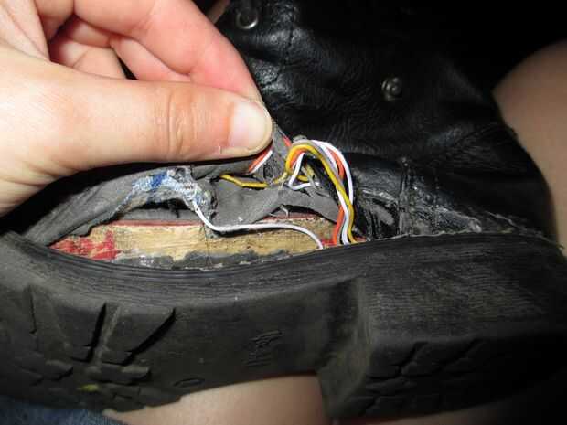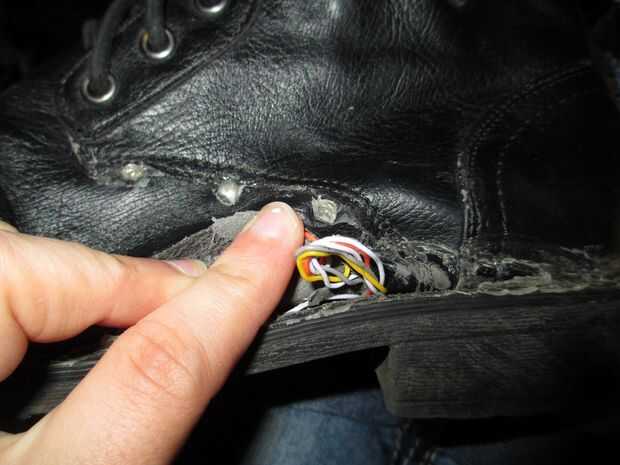 Rebanada de abrir entre la bota y el tacón, y cáscara lejos algunos de la cola para entrar en el zapato. No estoy seguro acerca de otros diseños, pero en estos zapatos, había dos capas de material - la piel artificial exterior y el interior forro de franela. Alimenta los cables entre estas dos capas (tuve que pelar aparte un poco), por lo que no existir cables pelados frotando contra mi pie en el interior de la bota.