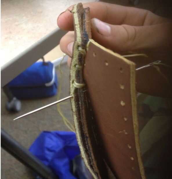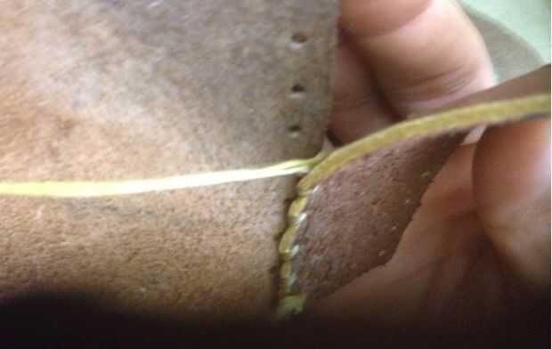 Ahora para empezar a coser juntos las botas reales. Primero tomar las piezas A1, A2 y B y comienzan a coserlas juntos en la esquina izquierda delantera. Para ello necesita utilizar una puntada inusual que es específica para cobblering: se desciende a través de los orificios de las dos piezas, pero en la tercera pieza, nos atenemos a la aguja hacia abajo en la parte superior pero hacia el lado, dejando completamente libre la parte inferior. Luego ir en el lugar donde la puntada siguiente será entonces hacia abajo a través de la parte superior para hacerlo de nuevo seguir la costura de esta manera hasta que hayas cosido alrededor del borde entero y une las piezas C, D y E. Entonces, comenzando en la parte inferior, coser la parte delantera del dedo del pie y coser a lo largo de la parte superior de aproximadamente 11/2 pulgadas, cortar la cadena y repetir del otro lado. en este punto necesitará dejar de coser y la placa del dedo del pie. Ahora terminar de coser los lados, colocar la pieza f el.