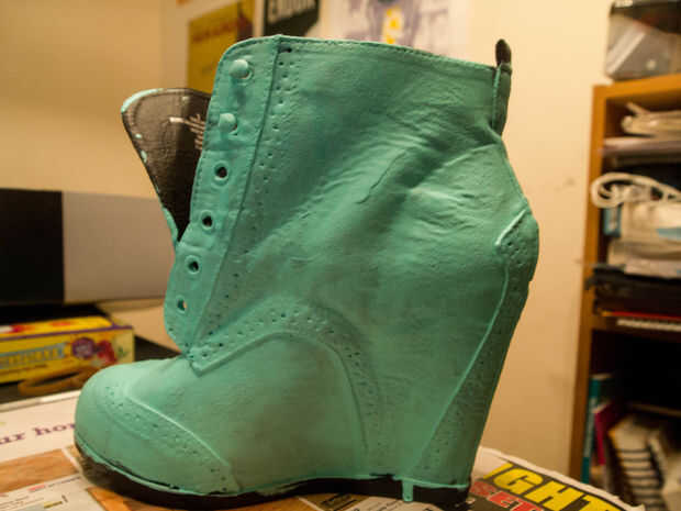 Me pareció más fácil pintar un zapato cuando usted su mano dentro de la zapatilla. Ayuda a mantener el zapato todavía y le permite alcanzar todos los rincones diminutos. Hubo algunos detalles plata a lo largo de donde son los cordones, pero me decidí a pintar sobre ellos. Ahora, esto es pintura de casa así que era muy plana en color y de tono--no terriblemente emocionante para un zapato.