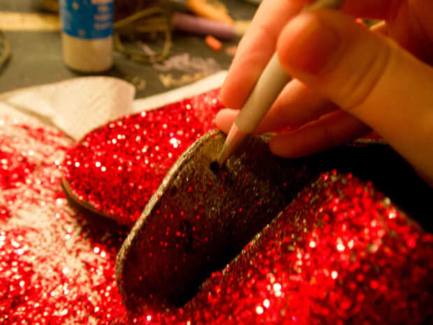 Una vez había rociado la capa final de brillo con dos o tres capas de laca clara, volví y penetra por los agujeros de cordón de zapato con un cuchillo del exacto. Era más fácil limpiarlos hacia fuera luego entonces habría sido para la pintura y brillo alrededor de los orificios.