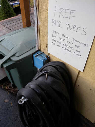 aquí es una manera rápida de convertir viejos tubos interiores de la bicicleta en lazos de tirón que tienen (bueno de todos modos un montón) de cientos de usos. Usarlos para cables, mangueras, correas, cubiertas de cable de freno y todo tipo de paque