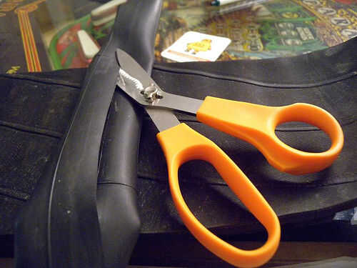 Corte el tubo de interior cerca de la espiga de la válvula y luego corte a lo largo de una línea que se encuentra en el interior del tubo.  Ahora corte unos trozos de cualquier forma los lados de la espuma.  Usted puede hacer un zapato medio como hice yo o todo el lado de una versión más resistente a la intemperie.