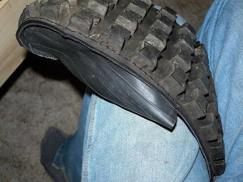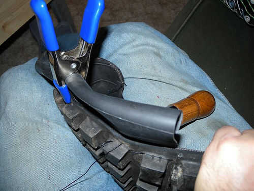 Unos fuertes binder clips o pinzas será útiles para formar el neumático y el tubo. No tenga demasiado miedo a sacar la costura y probar por si no te gusta el progreso. Mi primer uno que hice con dos paneles laterales y una superior. Terminó demasiado suelto. Así que modifiqué mi plan para un ajuste mucho más estricto. También, es mucho más fácil - sobre todo con el segundo lado cose con la lezna en el interior del zapato. De lo contrario, un par de alicates puede mantener de meter muchos agujeros en los dedos!