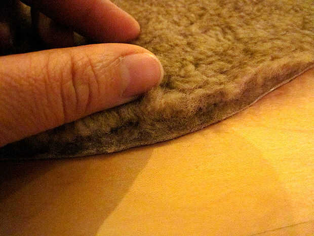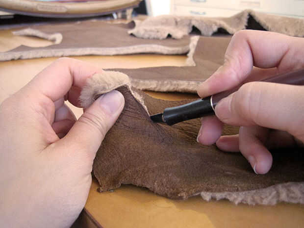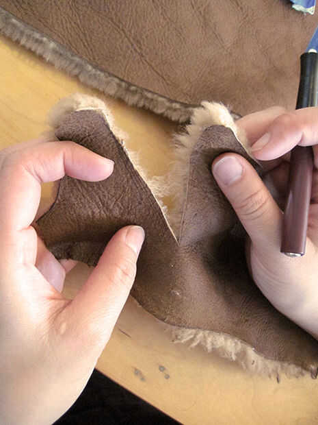 Para hacer cortes limpios agradables y evitar hacer un mugre, desorden lanudo corta la piel de cordero "de la alfombra" (ver segunda foto). Poner un disco nuevo de sharp en su x-acto. Con la mano no cuchillo, levantar un borde del material de la mesa unas pulgadas y sujete firmemente. Meter la punta de su cuchillo x-acto a través de la piel dentro de una de las líneas marcadas. El punto del cuchillo nunca debe tocar la superficie de trabajo. Tire el cuchillo hacia usted a lo largo de las líneas del patrón (corte dentro de las líneas) girando el cuero como vas. Si utiliza una cuchilla nueva esto no debería tomar mucha fuerza en todo. No trate de cortar a través de la lana: una vez que el cuero se corta se separará fácilmente.