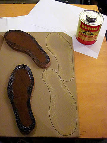 muy bien ventilado espacio.  Extienda ambos patrones único (izquierda y derecha) sobre la goma espuma y rastro pero no corte.  Extender una generosa capa uniforme de cemento barcaza sobre 3/4" interior y 1/4" más allá de la línea trazada.  En la oveja soles cepillo de cemento alrededor del perímetro también unos 3/4".  Trate de no obtener ningún cemento en el lado de la lana.  Asegúrese de que las piezas están completamente cubiertas en estas áreas pero no utilizan tanto pegamento que es drippy.