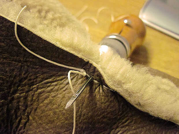 Tener cuidado con sus dedos y LAP! La lezna de costura es agudo agudo agudo y puede ir a través de ti tan fácilmente como puede ir a través de la piel.