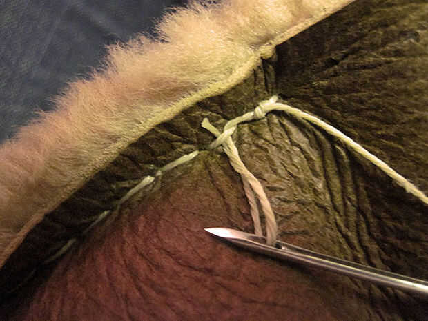 Comienzan con la costura del talón. Alinee los bordes de la costura trasera de uno interior y exterior de una pieza superior. O ligeramente Marque una línea de costura 1/4" desde el borde o globo ocularlo. (Soy un eyeballer que lo admito) Hacer tus puntadas aproximadamente 3/8" de largo. Demasiado corto y su piel apenas perforar y desgarro. Demasiado largo y aparte más adelante. Puede sostener las piezas con clips de carpeta si le gusta pero no use alfileres! Agujeros en cuero son permanentes. Usé la punta de la lezna para embromar hacia fuera la lana cuando fui a lo largo de para frío máximo. Ate el hilo con un nudo cuadrado al final de la costura y meter los extremos antes de recorte (ver fotos).
