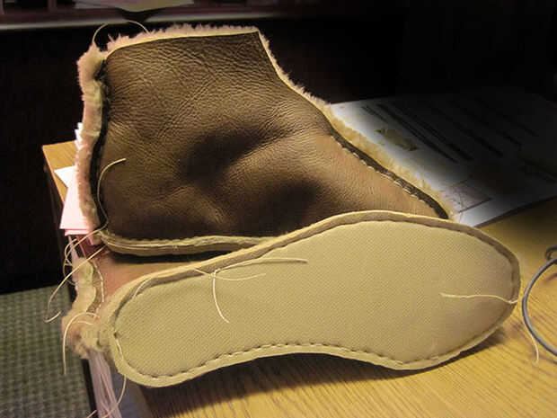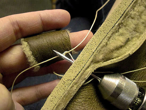 Marque las líneas centrales del patrón único en los dedos y zagueros en su goma oveja única. Alinee las costuras en las partes superiores a estas marcas y sujetar con los clips de la carpeta. Comenzar a coser con la lezna de costura como las partes superiores meter el punzón a través de todas las capas perpendicular (ver foto #2 abajo). Tire del hilo firmemente bastante a la goma espuma un poco pero no tanto que rasga a través de la espuma hoyuelo. Esto es especialmente importante si utiliza Esteras antifatiga como se rasgan muy fácilmente.
