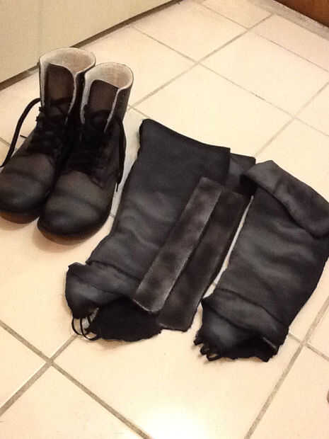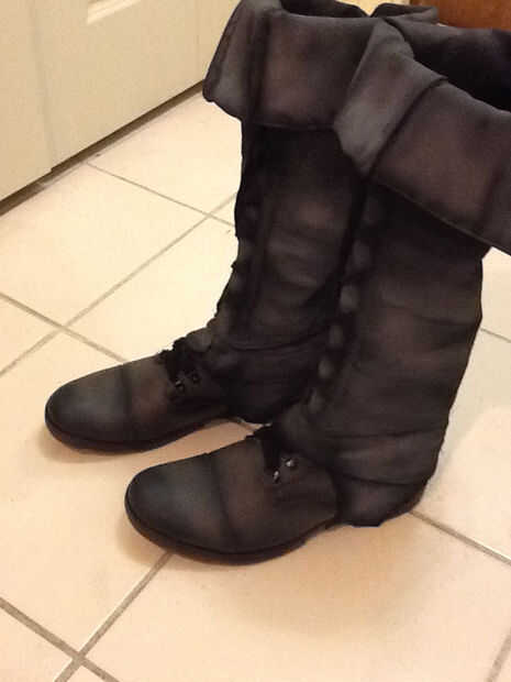 entonces, fui en línea, buscando qué zapatos Capitán América viste bc que quería hacer un traje para ser él. En primer lugar, oí fue botas paracaidista, pero luego en un sitio web diferente, Leo fue viejas botas de guerra. A pesar de todo, fui a una búsqueda para comprar un par solo para encontrar cualquier fresco buscando pareja era demasiado caro para comprar solo por diversión. Así que decidí que iba a tratar de hacer mi propia. Sabía que no podía construir realmente un par completo de botas desde cero, pero he encontrado un par de botas se desvaneció de gris/negro que estaban a la venta en Khols por $25. Sólo tenían 2 pares pero por suerte uno de ellos era mi talla. Pensé que intentaría coser un par de "polainas" ir encima de ellos para construirlos hasta la rodilla, como viste en la película.  Hacer disfraces como un hobby tan comenzó a coser la pista de despegue, poner el material sobre las botas y custom colocándolos sobre el maletero y en mi pierna, así. Después de que fueron cosidos, me sacaron mi aerógrafo y comenzó a pintar el material. He tratado de pintar como imitación de cuero lo mejor que sabía cómo n cómo la tela aceptaría la pintura. Luego he añadido un cierre de Velcro en la parte posteriora (aerosol pintado para emparejar) por lo que sería un ajuste apretado y me gusta un poco cómo resultó. Sé su tienen un tinte rojo a ellos pero me gusto un poco la mirada resistida estas botas tenían así que simplemente guardé gris. Ahora sólo que ir conseguir unos guantes n pintarlos de la misma forma y terminar el atuendo.