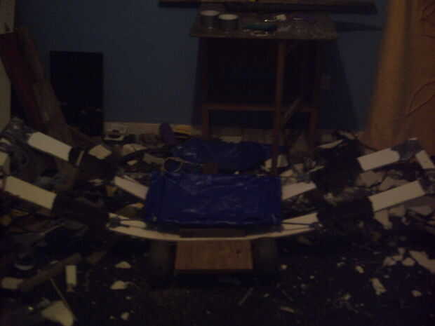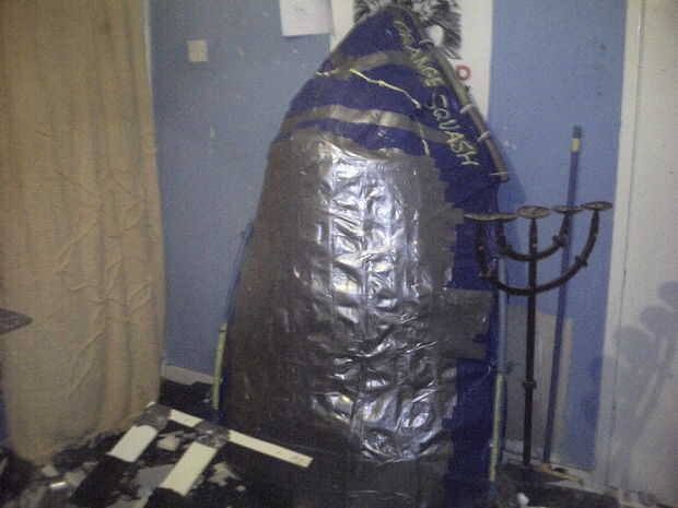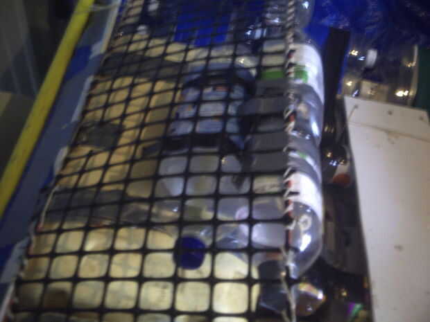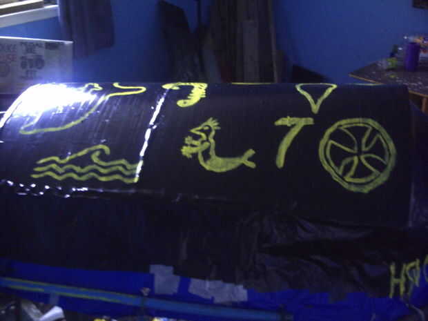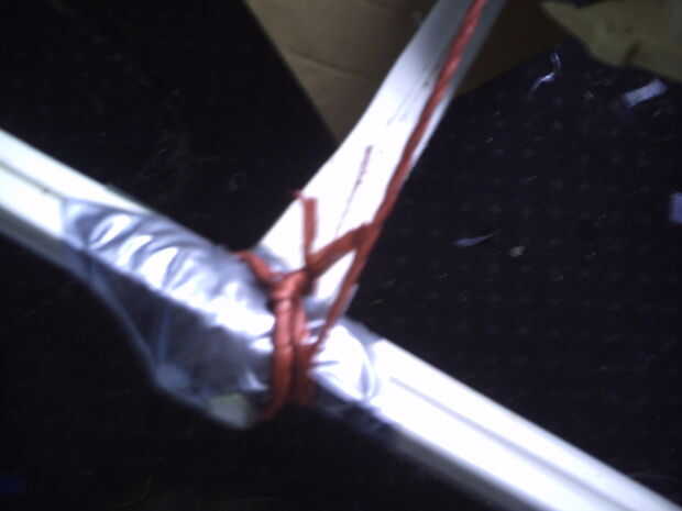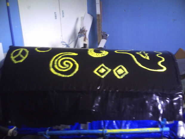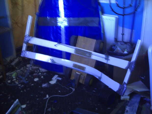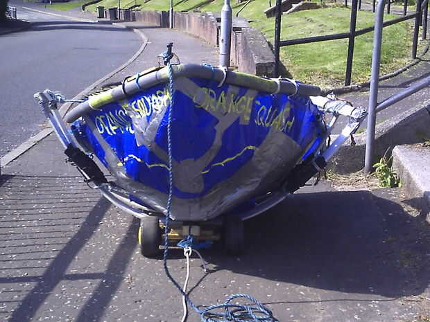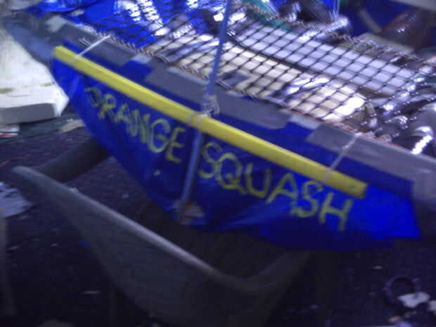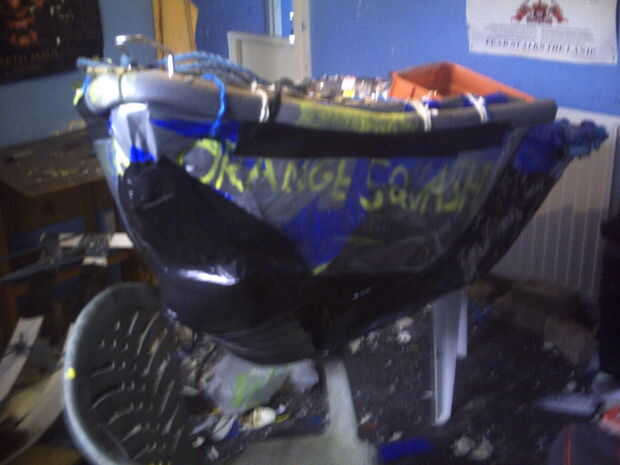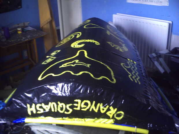 botellas de plástico de jugo, sobre todo 750ml tamaño pero hay son utilizaron unos 500ml y 1 litro y 1,5 litros botellas y bloques de poliestireno foam.6 x 26 interior de moto de pulgada tubos donde también. Costos en aproximadamente 12 libras de 3 hojas de lona plástica de poundland, cada tamaño de 4 pies x 3 pies y unos 10 rollos de cinta adhesiva y 1 rollo de cuerda de nylon. El bote me tomó alrededor de una semana para hacer y he nombrado naranja cubierto por el plástico
